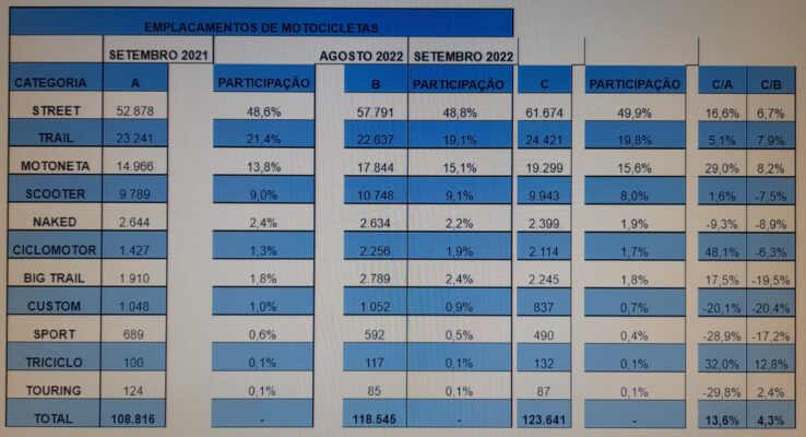 Na comparação com o mês do ano passado, houve crescimento de 13,6% (108.816 motos) e em relação a agosto, a alta foi de 4,3% (118.545 unidades).