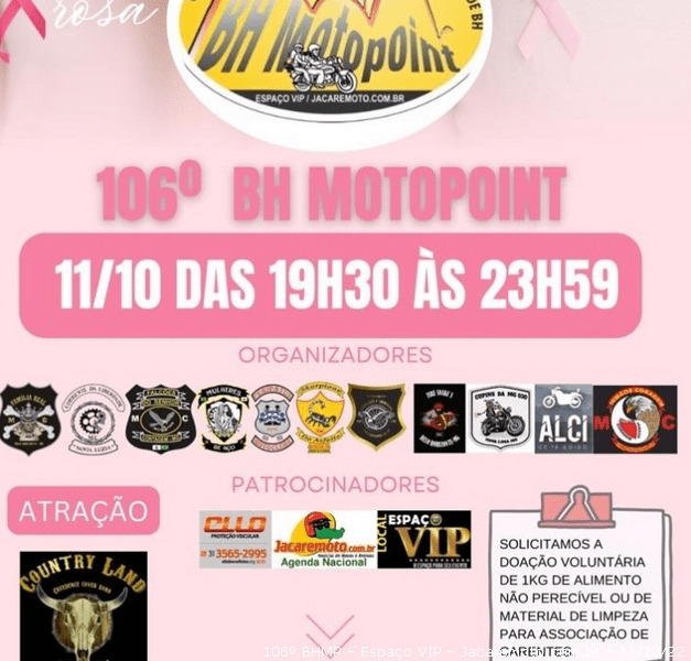 Terça, 11/10/22 – Vejam as fotos abaixo. O 106º BH Motopoint (BHMP) foi muito animado e teve um grande show da banda Country Land (Creedence cover), que agradou muito e fez o publico vibrar.