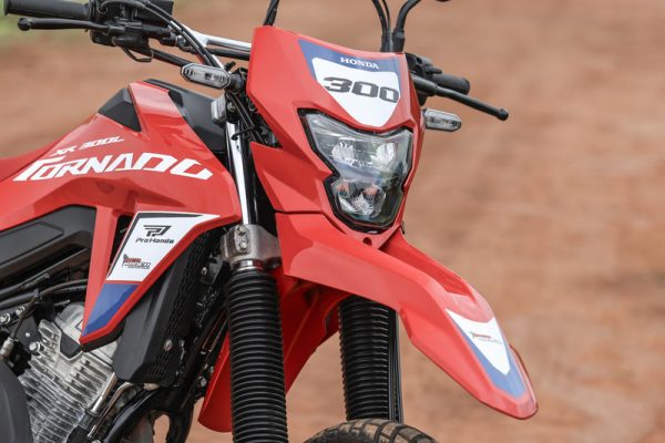 Aliás, é exatamente o “Fighting Red” a cor base para a criação da XR300L Special Edition. A agressiva tonalidade, característica das Honda “de briga”, destaca esta Tornado, que traz também discretos detalhes em branco e azul formando o clássico tripé cromático das Honda mais radicais.