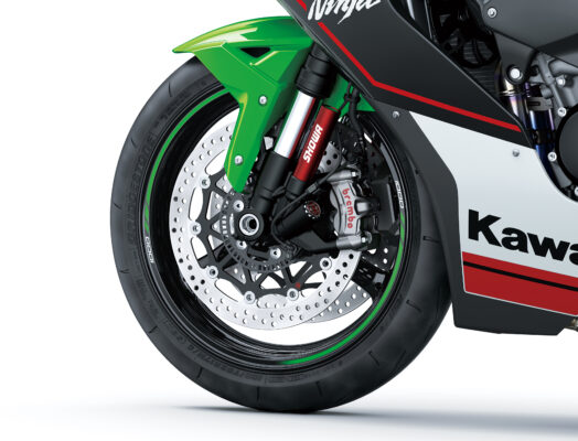 No sistema de freios da versão 2022 da ZX-10R, a superesportiva da Kawasaki manteve a alta performance de frenagem da Brembo com a utilização de ABS de fábrica.