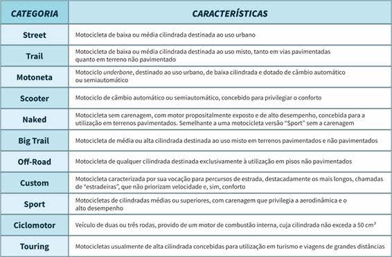 Com 46.200 unidades emplacadas e 51,5% do mercado, a Street foi a categoria mais licenciada em janeiro. Em segundo lugar, ficou a Trail (15.832 unidades e 17,7% do mercado), seguida pela Motoneta (13.160 Motos e 14,7%).